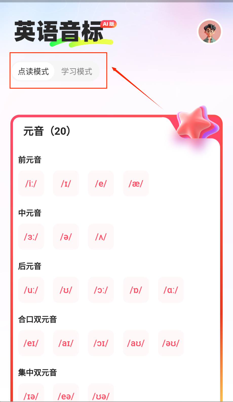 1、音标学习模块完整收录48个国际音标的标准发音示范,每个音标都配有详细的发音要点解析和练习指导。