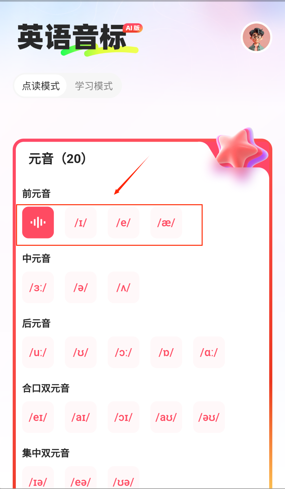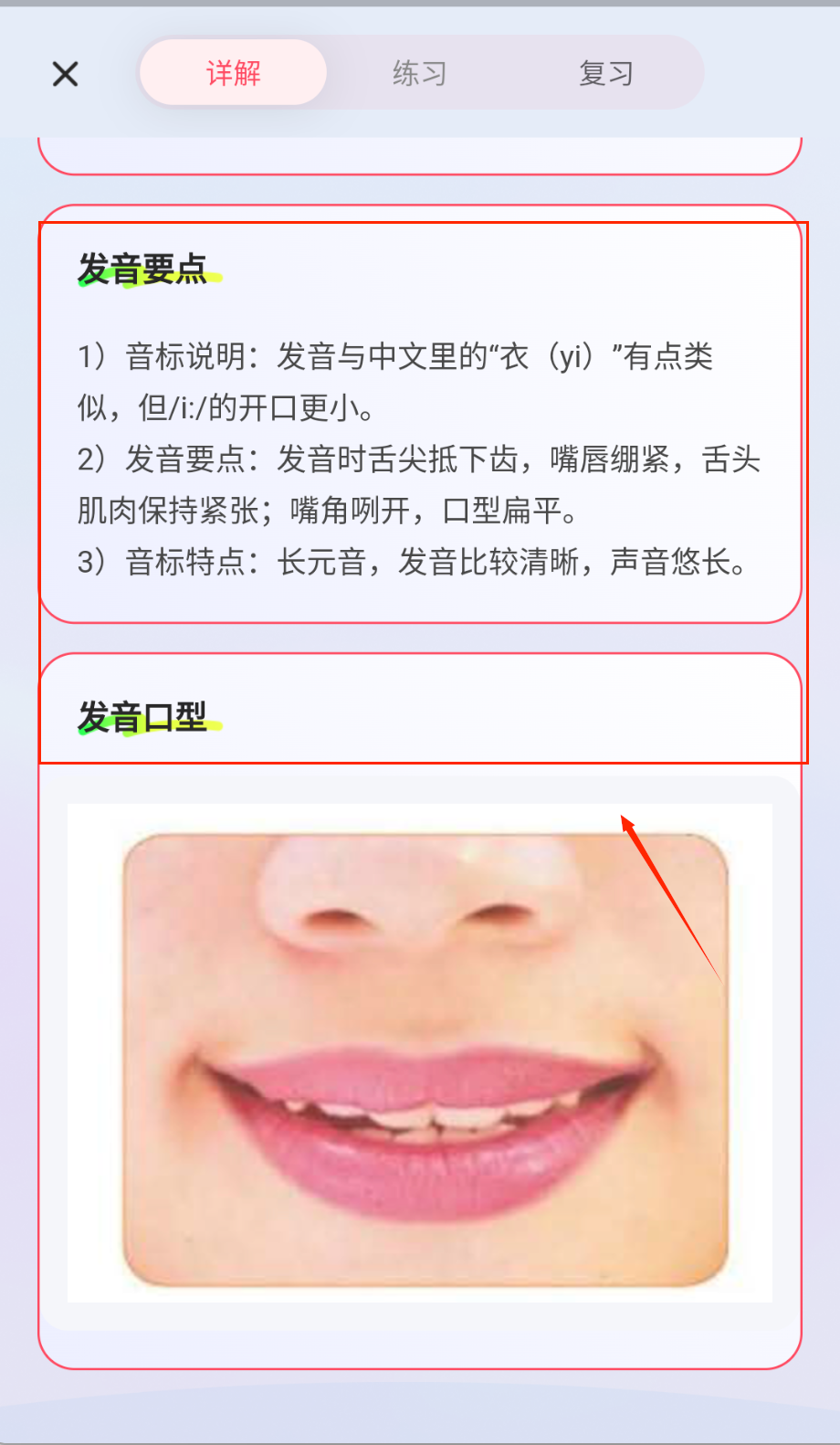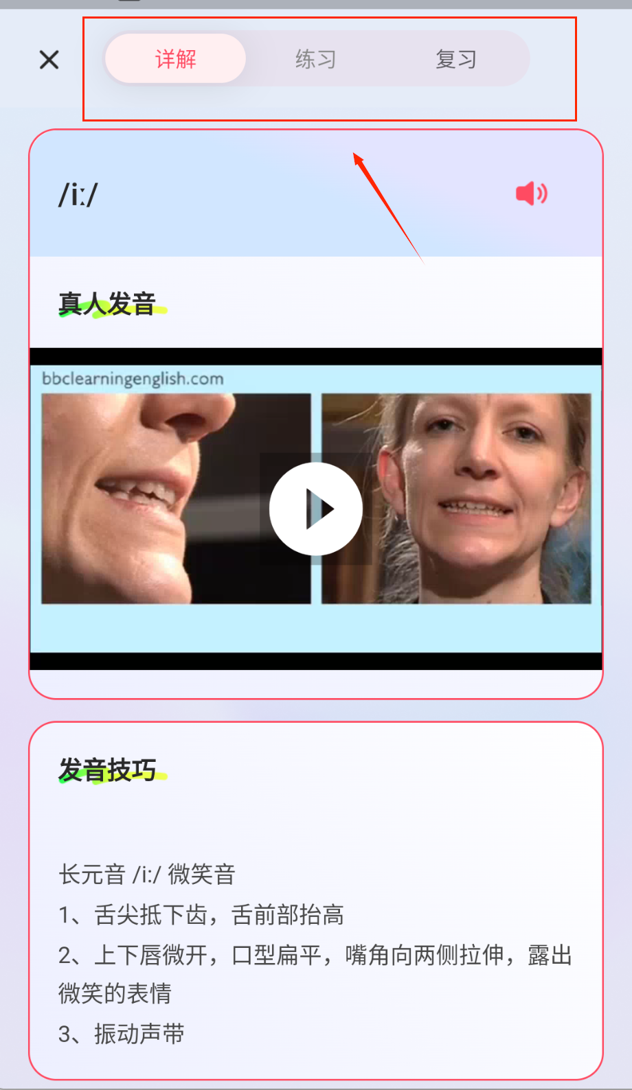 2、仔细观看平台提供的标准音标发音示范视频,重点观察发音时的口型变化和舌位摆放,跟随示范进行多次跟读练习。