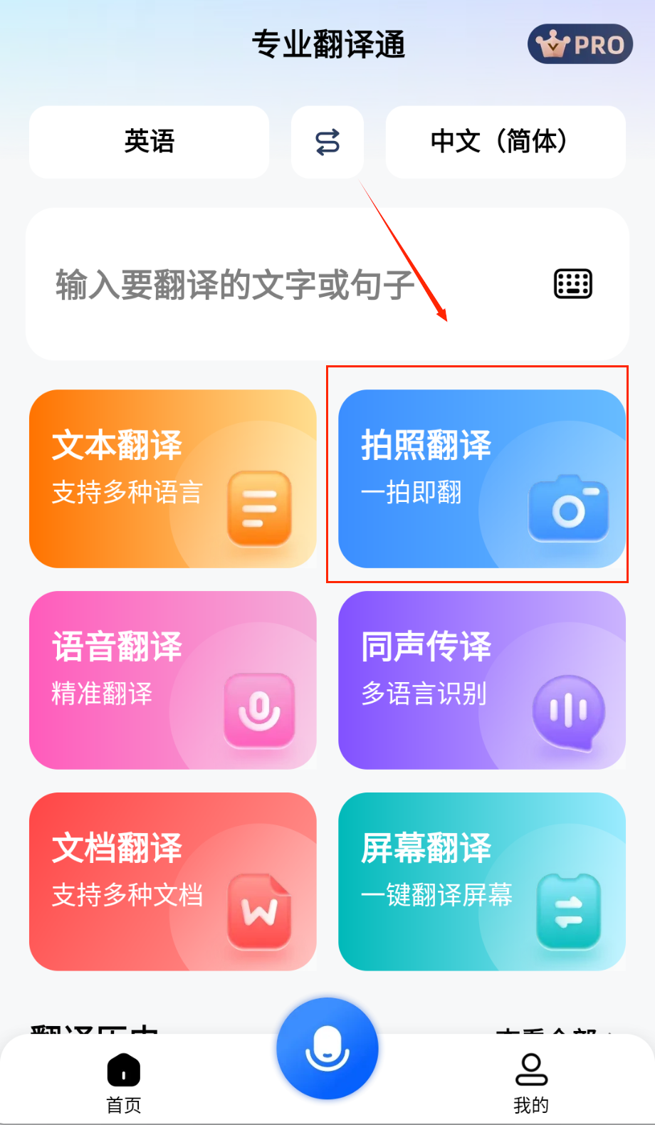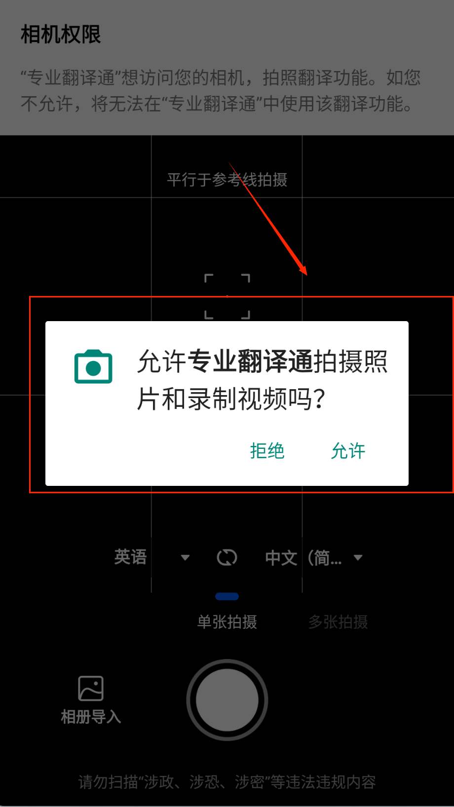 1、启动APP后进入主界面,找到并点击拍照翻译功能图标,首次使用需授权相机权限以便拍摄需要翻译的文字内容。