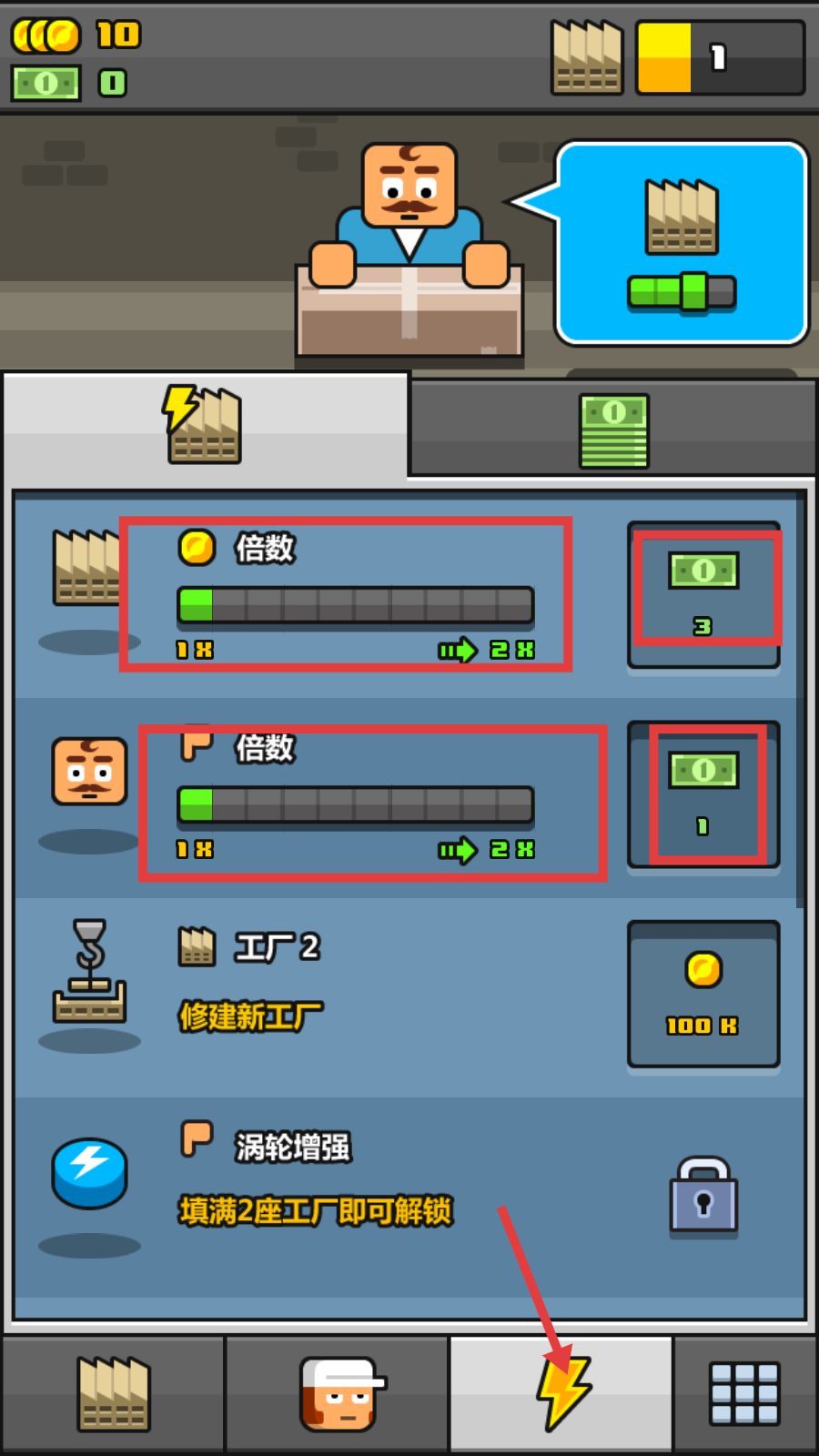 4、点击闪电图标,使用资源解锁新工厂、增强产能,扩大规模。
