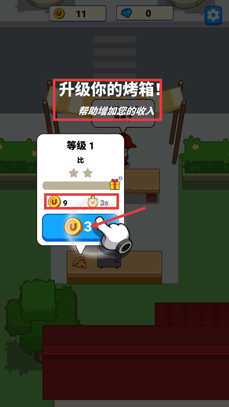 3、金币够时点升级烤箱,花3金币提效率与收入。