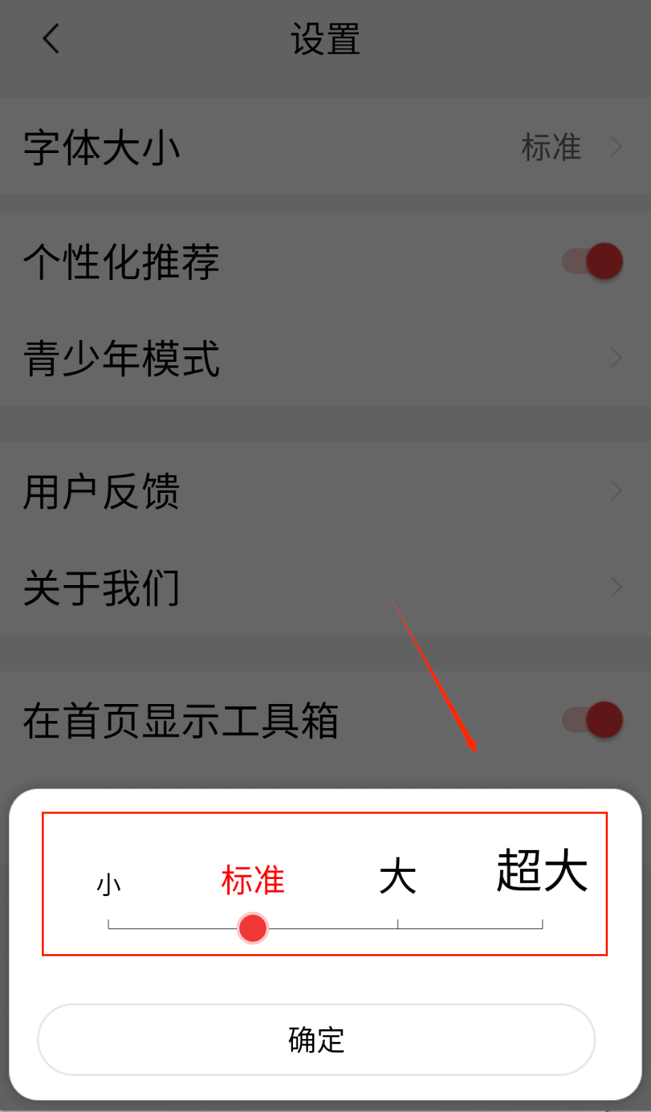 2、通过左右滑动调节条可以实时预览不同字号效果,选择标注为"超大"的字体模式后点击确认保存当前设置。