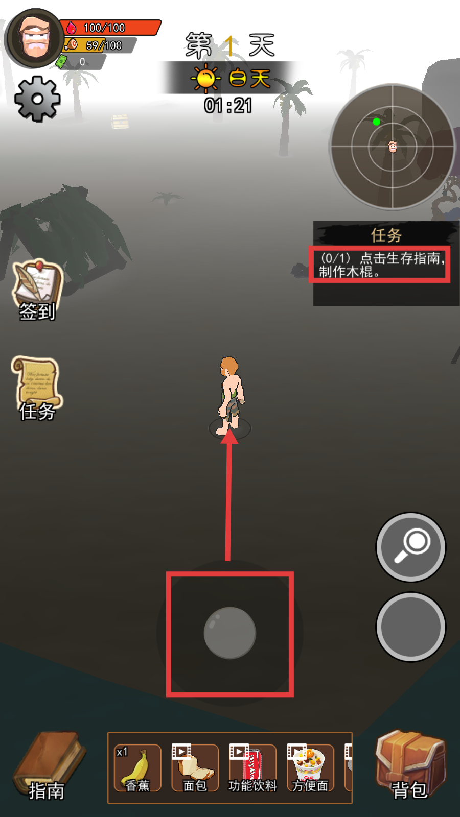 1、第1天白天操控虚拟摇杆移动,优先推进【(0/1)-点击生存指南-制作木棍】的初始任务。