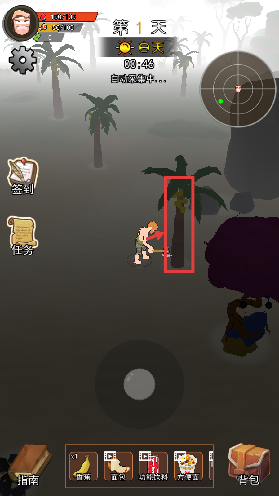 2、白天靠近树木自动采集,留意【饥饿值-50/100】变化,积累木材等制作资源。