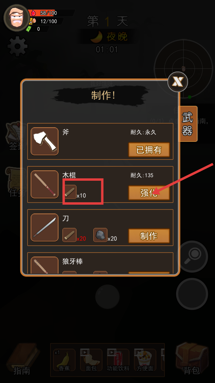 3、夜晚进入制作界面,凑齐10根木材可强化木棍,提升【耐久-135】的武器性能。