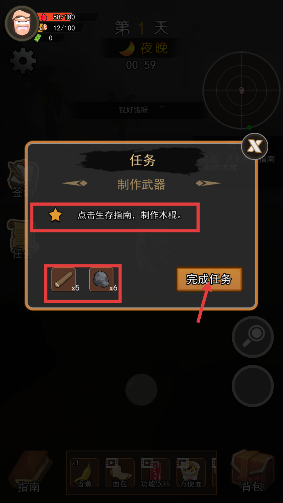 4、收集5根木材与6块石头后,完成【点击生存指南-制作木棍】任务,点击完成结算奖励。