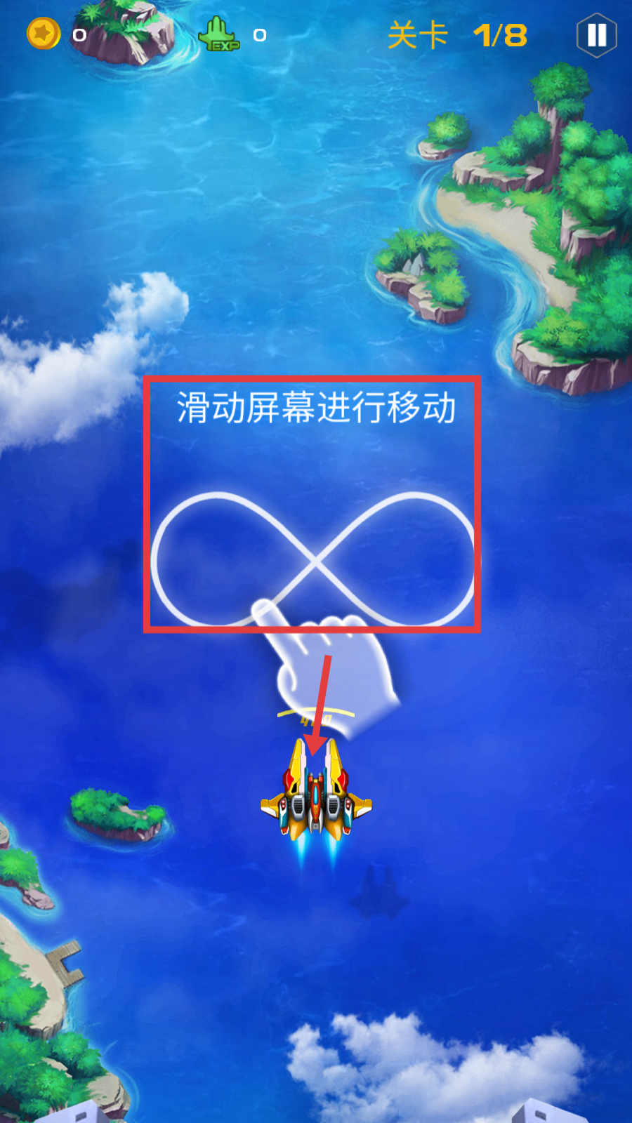 1、关卡1/8初始阶段,按照指引【滑动屏幕进行移动】,快速熟悉战机操控方式。