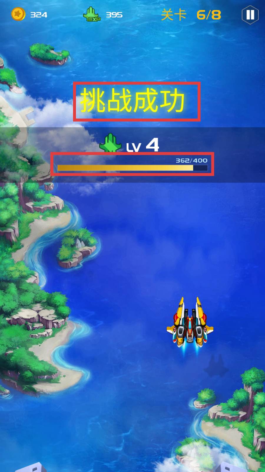 4、成功通关关卡6/8,解锁【挑战成功】,战机升至【Lv4-362/400】经验,稳步推进。