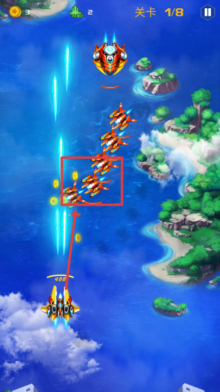 2、空战中瞄准敌方编队射击,躲避蓝色弹幕,顺路拾取【金币】,积累资源提升战力。