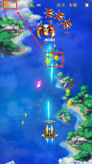 3、优先击落带【40】分值目标,多收集金币,让左上角【金币-15】持续增长,助力强化。