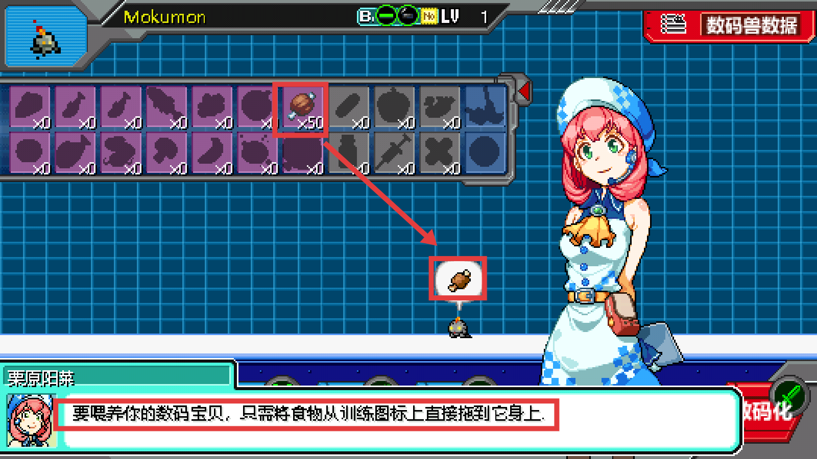 2、喂养数码兽时,将【训练图标-×50食物】拖至其身上,完成初始养成操作。