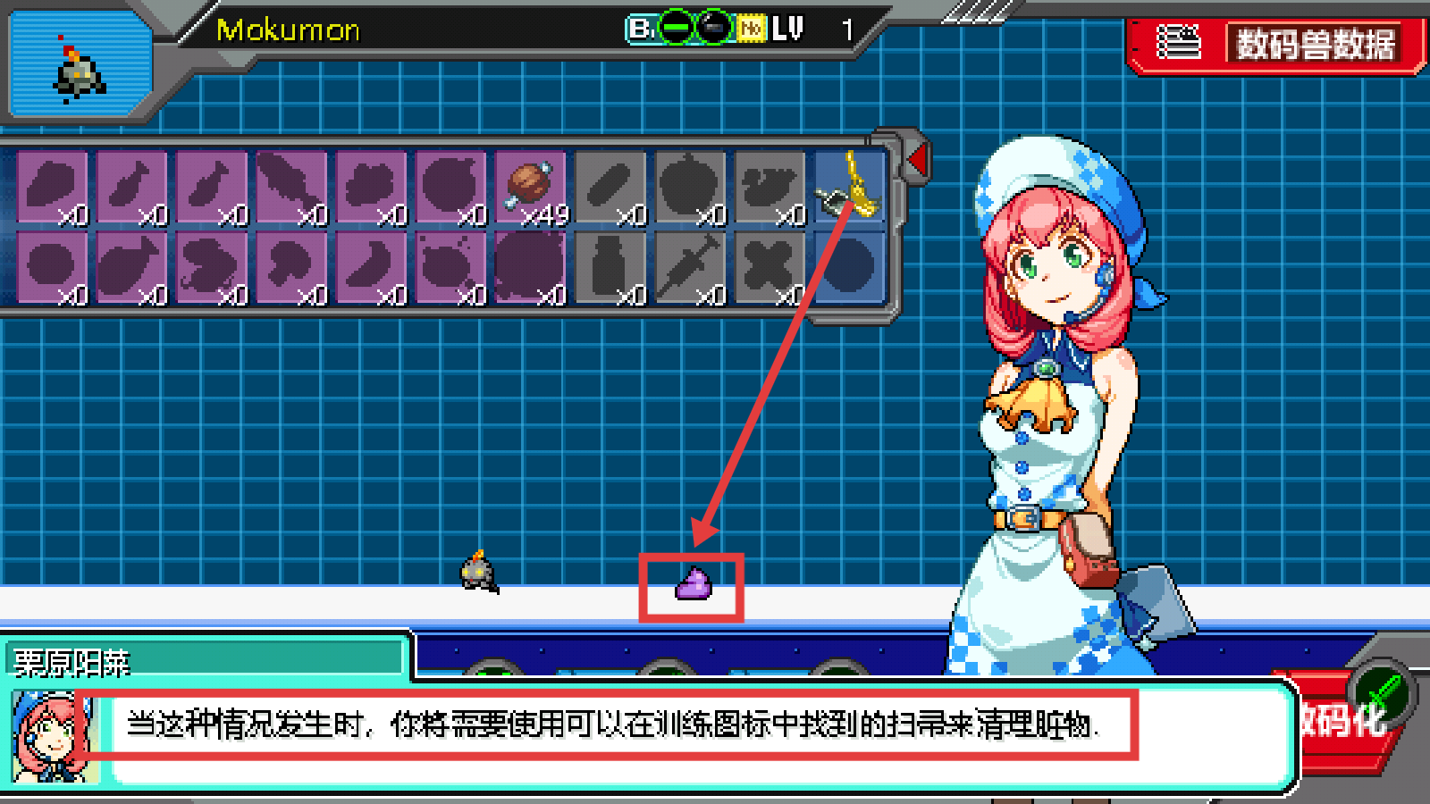 3、若数码兽旁有赃物,从【训练图标】拖出扫帚道具,点击清理保持环境。