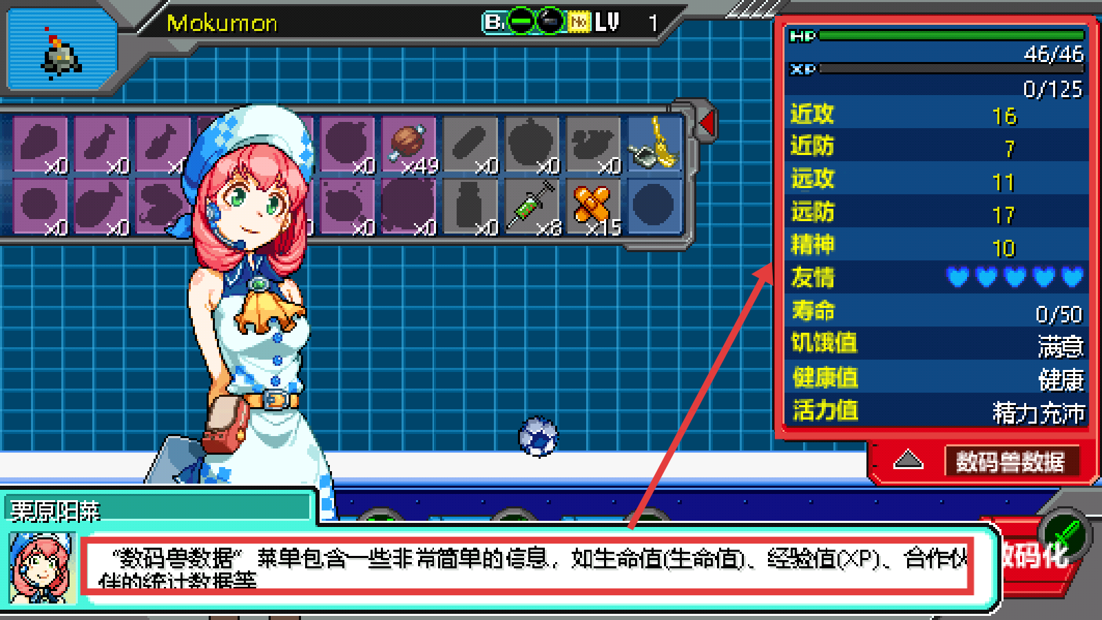 4、查看【数码兽数据】菜单,了解【HP-46/46】【XP-0/125】等属性,掌握成长状态。