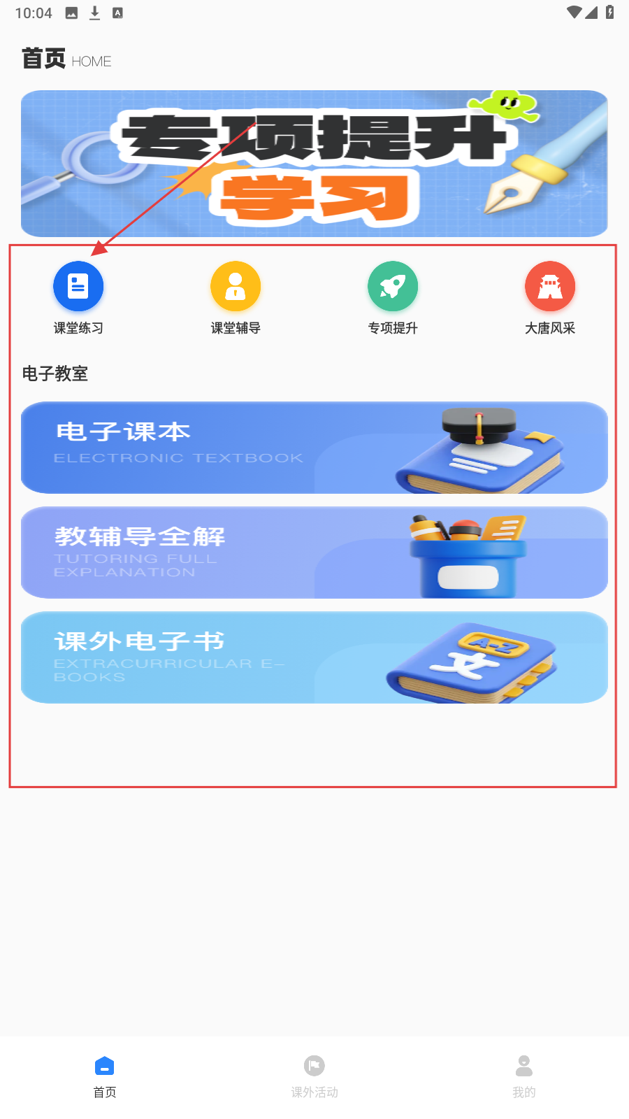 1、打开APP首页,点击【课堂练习】进入练习选择界面开启学习。