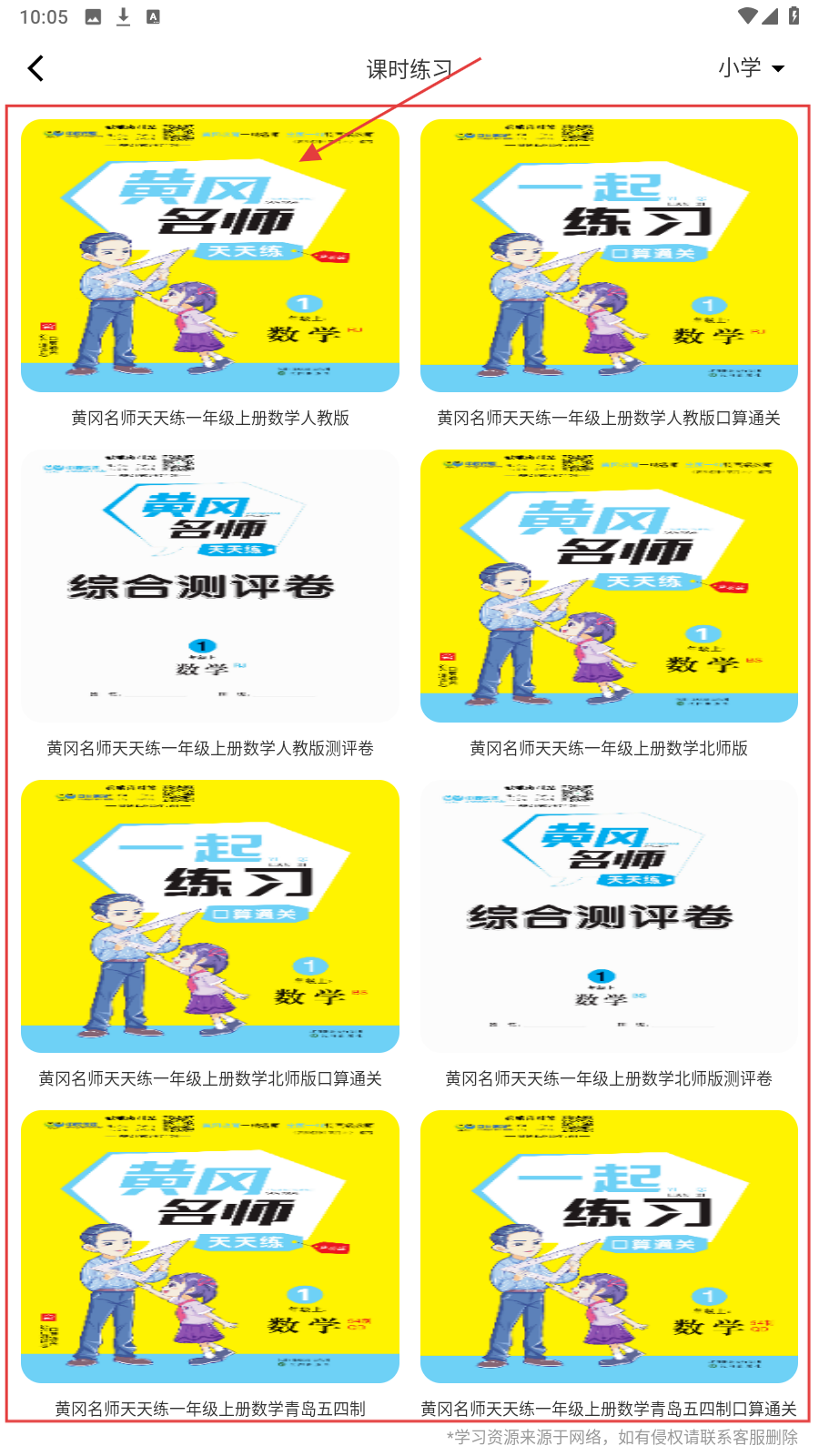 2、在练习界面,选【黄冈名师天天练】对应年级学科练习册开始练习。
