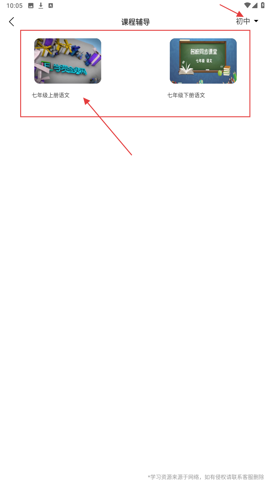 4、返回首页,点【课程辅导】选初中语文课程(如七年级上册)学习。