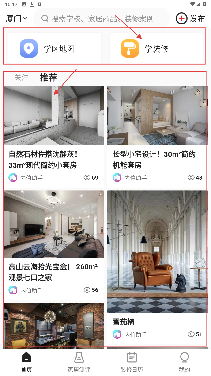 1、想了解装修案例,进入首页点【学装修】,在【推荐】栏浏览多样风格装修实例找灵感。
