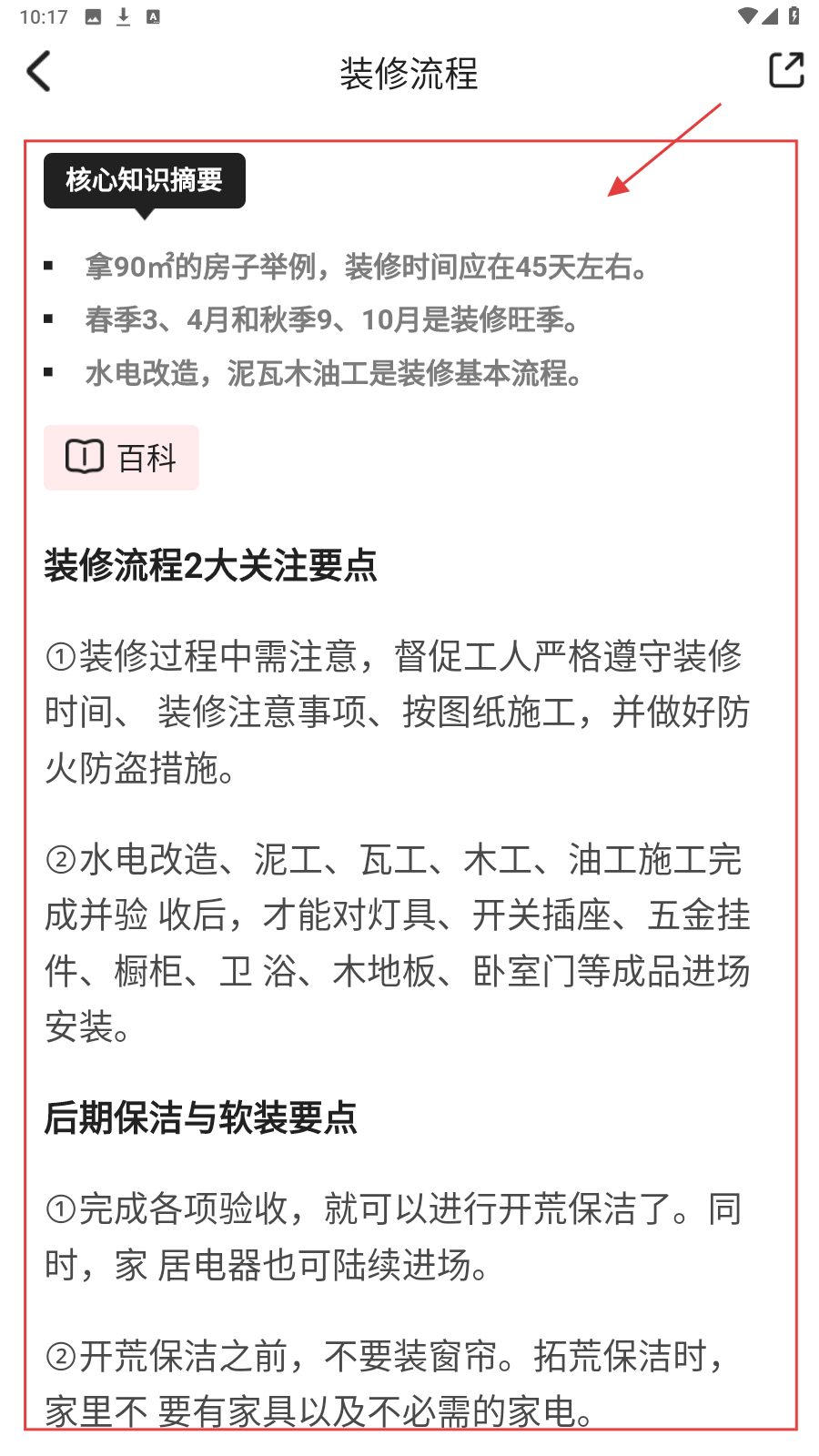 4、研究装修流程,查看【核心知识摘要】及要点,掌握工期、旺季、施工顺序等关键信息。