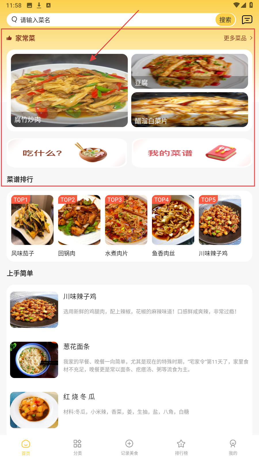1、打开APP,在首页选家常菜板块,浏览“腐竹炒肉”等菜品,点图进详情。