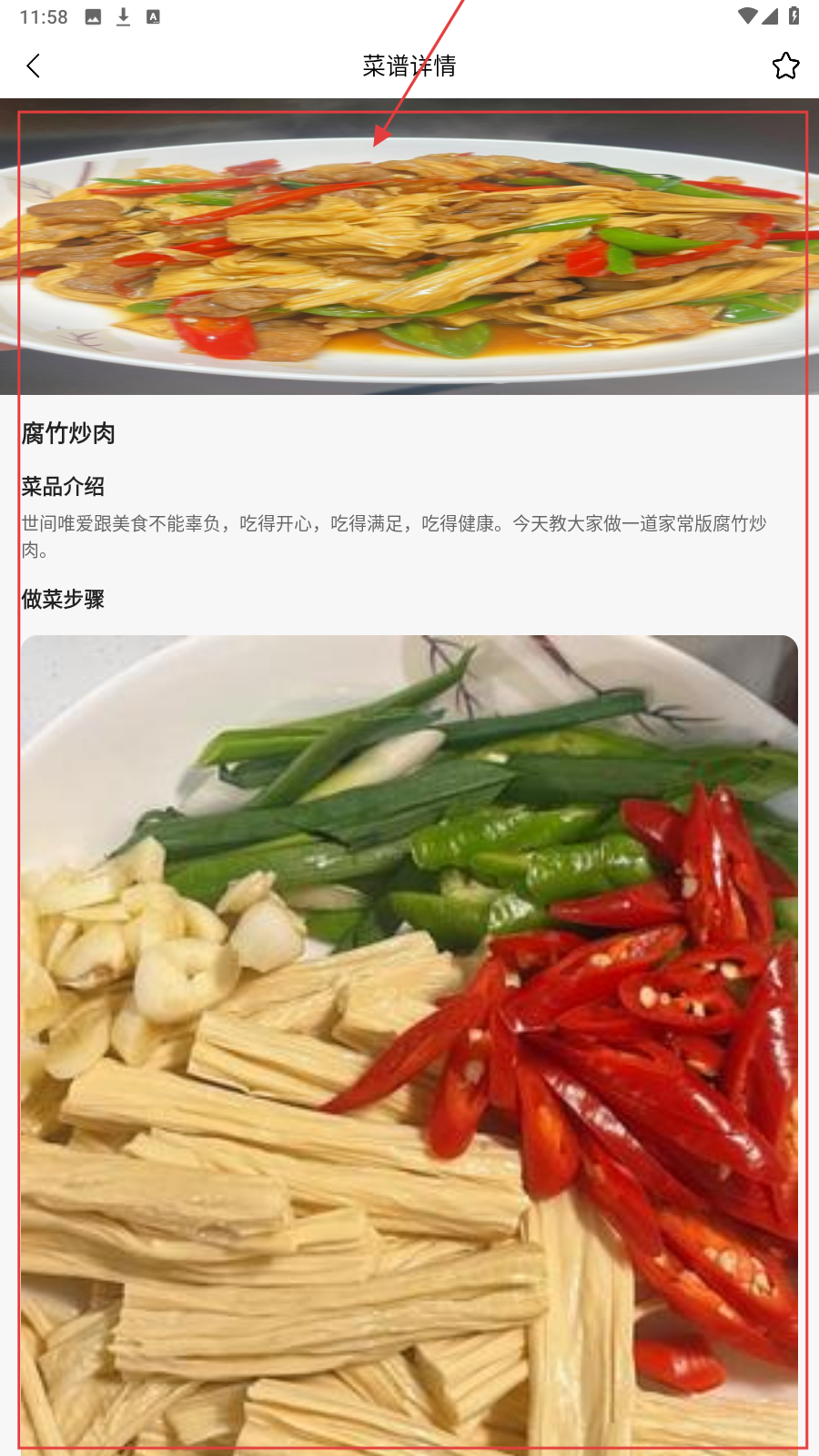 2、进入【腐竹炒肉】详情,看菜品介绍和做菜步骤,学家常做法。