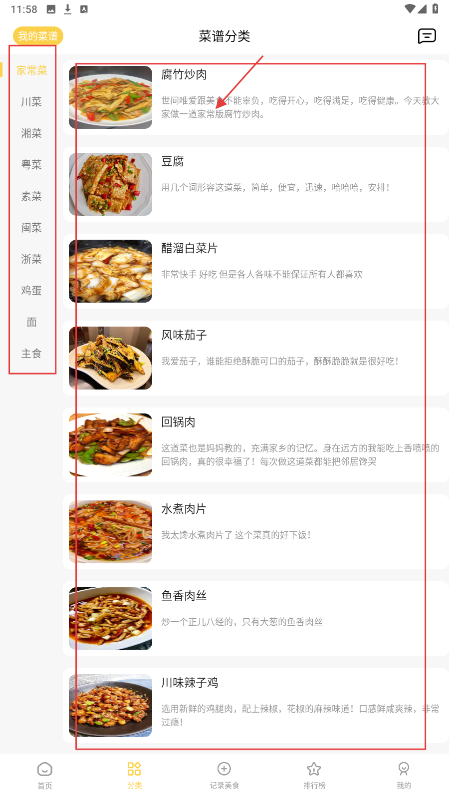 3、还可以点【分类】,选【家常菜】等分类,浏览对应菜谱列表,找想做的菜。