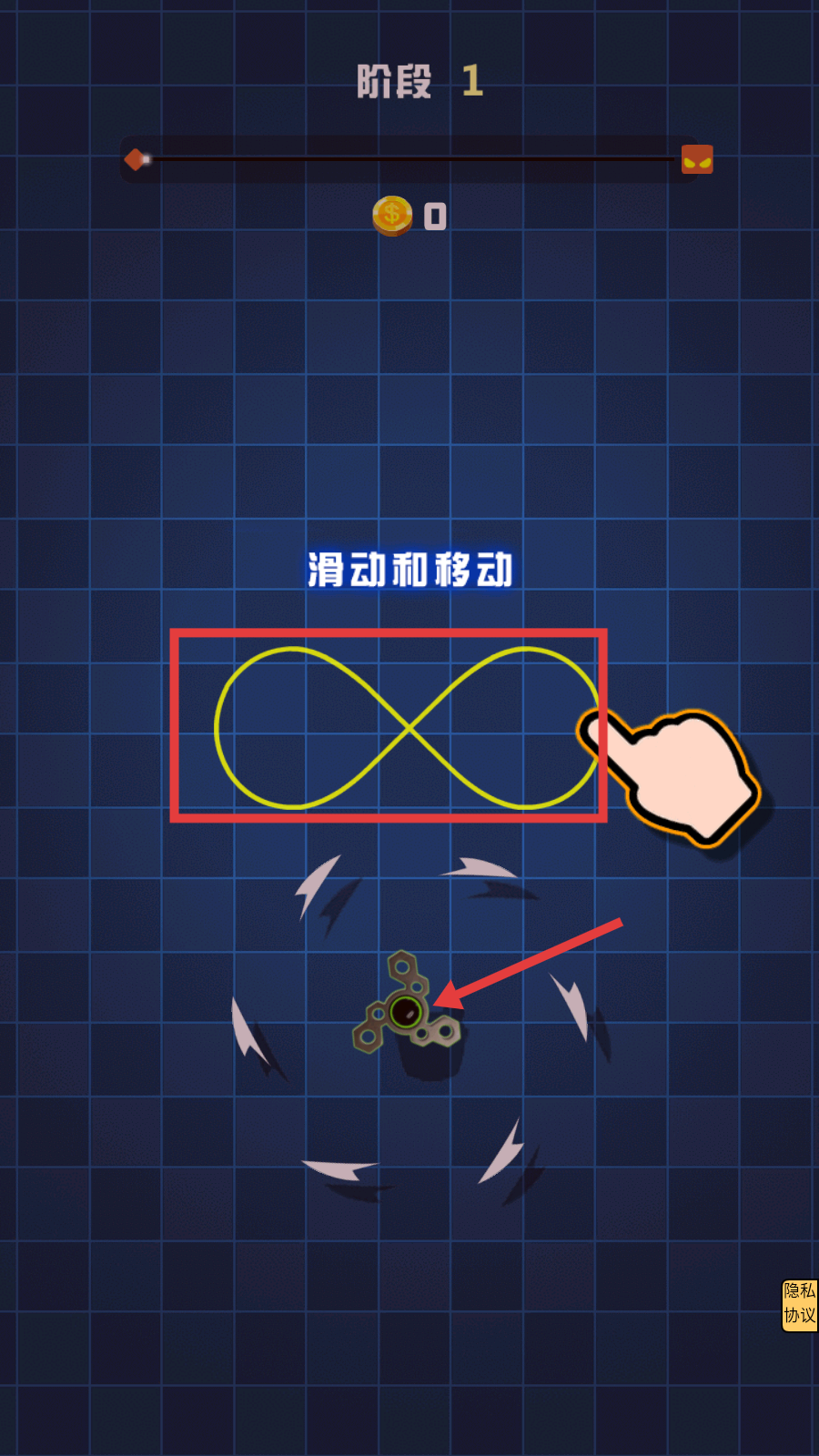 2、阶段1按提示【滑动和移动】陀螺,熟悉∞形轨迹,掌握移动技巧。