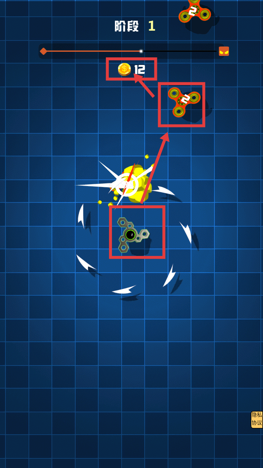 3、战斗中操控陀螺击碎橙色敌人,收集【12-金币】,积累资源提升实力。