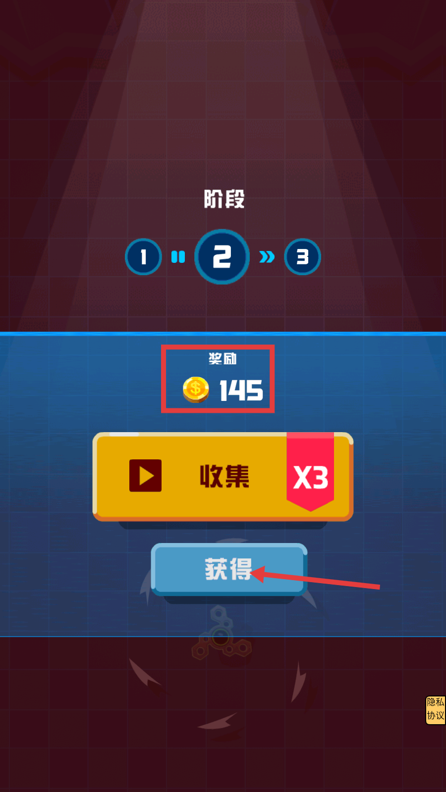 4、阶段1通关后,点击【获得】领取【145-金币】奖励,解锁阶段2继续冒险。