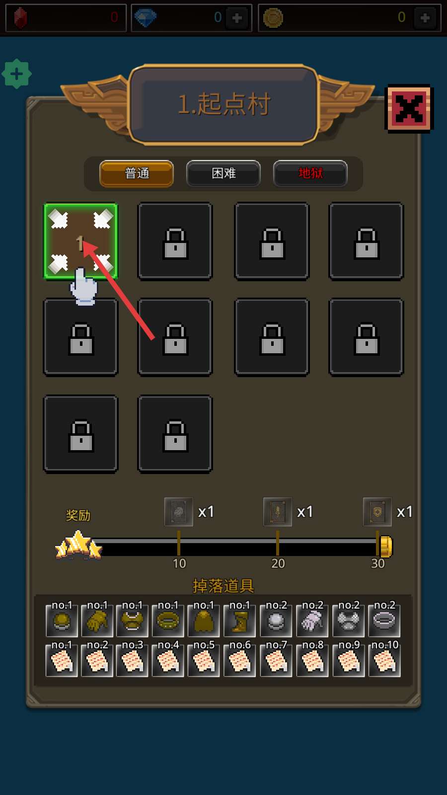 1、点击【起点村-普通难度-第1关】,开启首战,逐步解锁后续关卡与奖励。