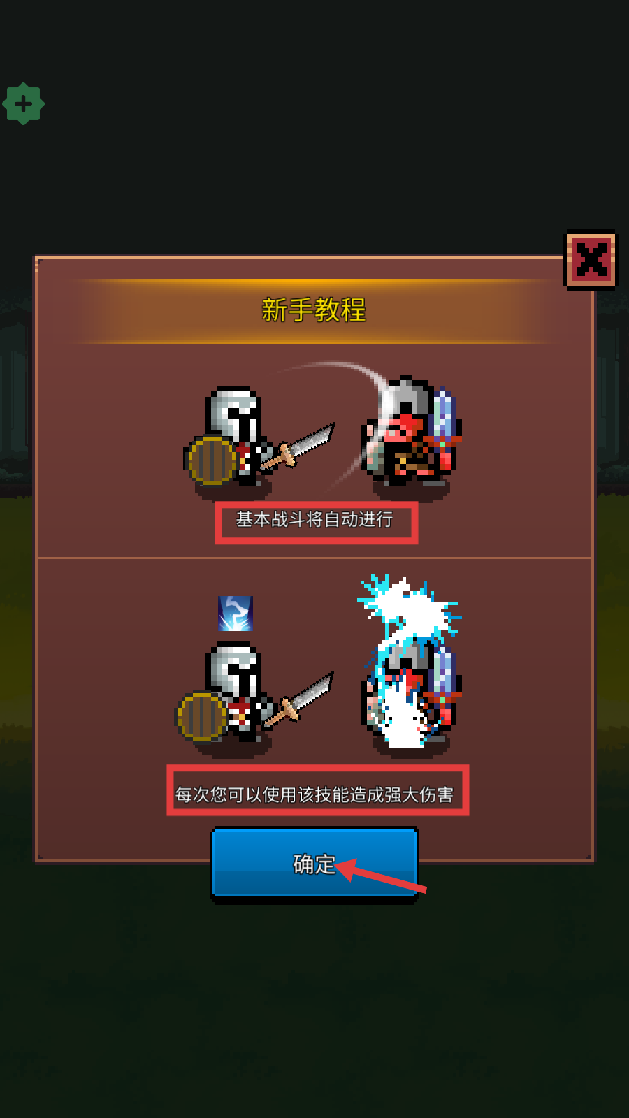 2、完成【新手教程】,了解基本战斗自动进行、技能可造强伤害,点击【确定】推进。