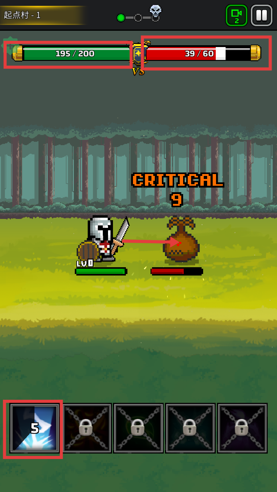 3、战斗中关注【195/200】【39/60】血量,适时释放左下角技能(剩余5次),触发暴击输出。