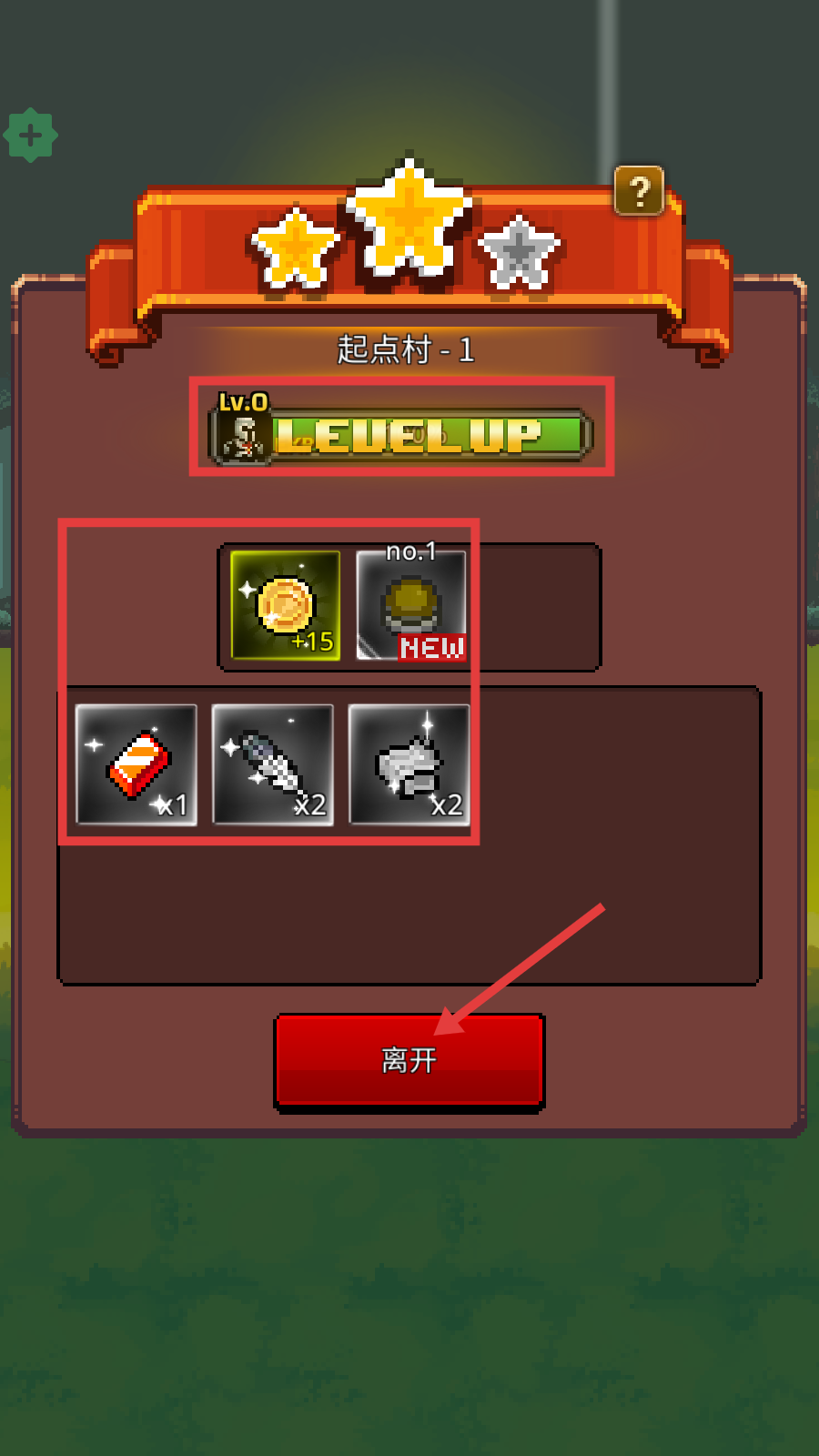 4、通关【起点村-1】后,领取等级提升与金币、道具,点击【离开】,筹备后续挑战。