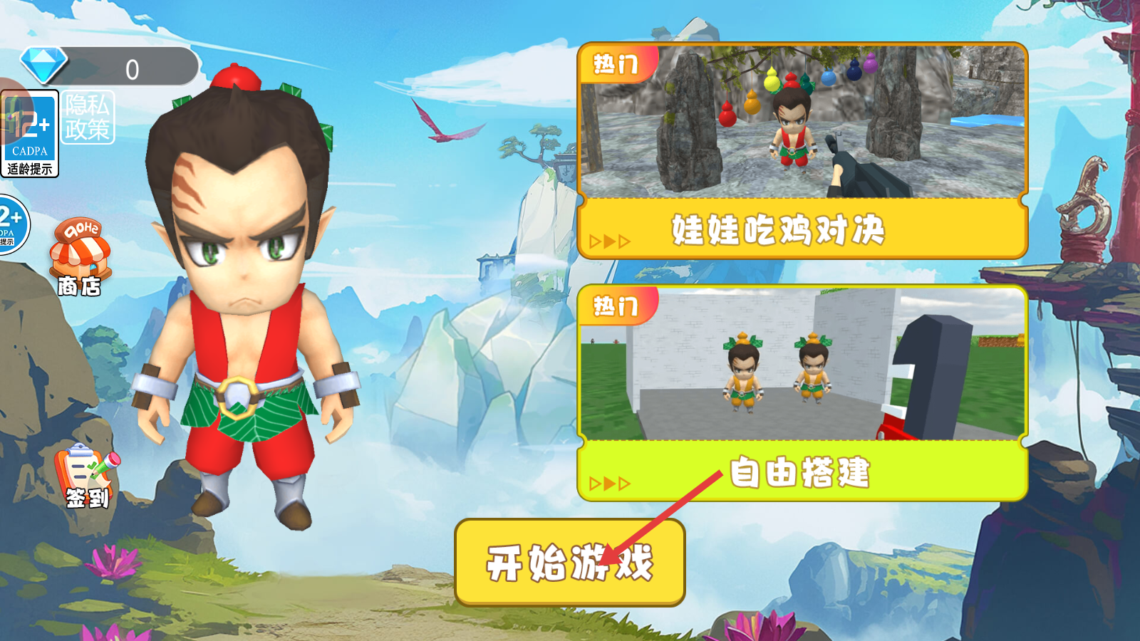 1、进入游戏先浏览【娃娃吃鸡对决】【自由搭建】等模式,点击【开始游戏】开启冒险,别忘留意【12+-CADPA适龄提示】。