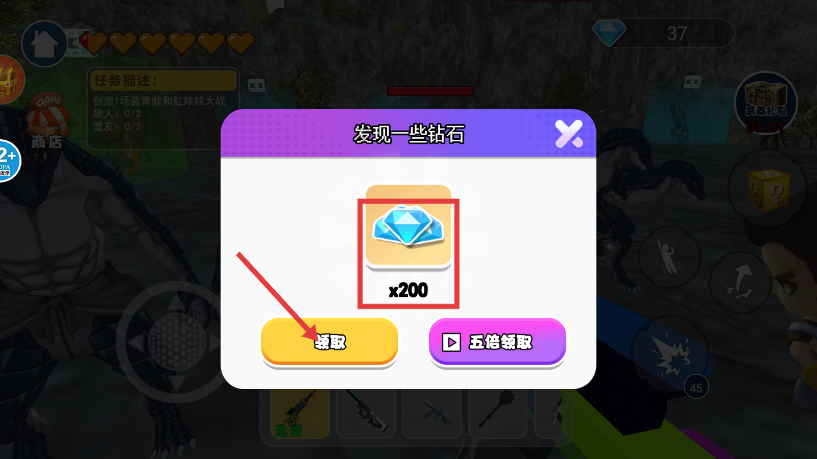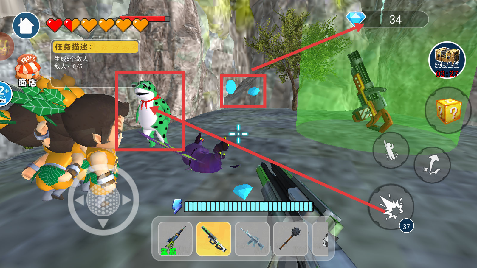 3、承接任务【生成5个敌人-0/5】,击败怪物收集蓝色钻石,更换强力武器提升战斗效率,完成目标。