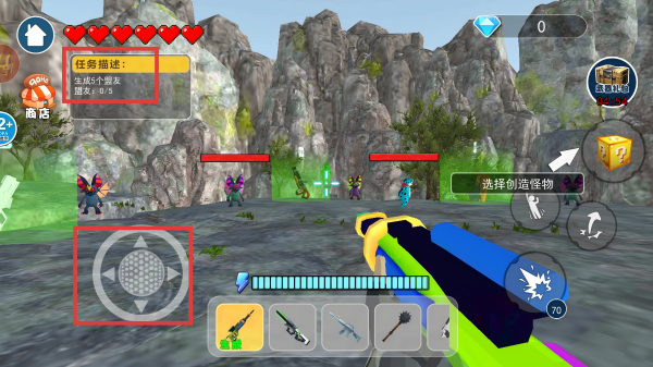 2、冒险中先完成【生成5个盟友-0/5】任务,利用左侧方向键操控角色,搭配武器应对怪物,推进进度。