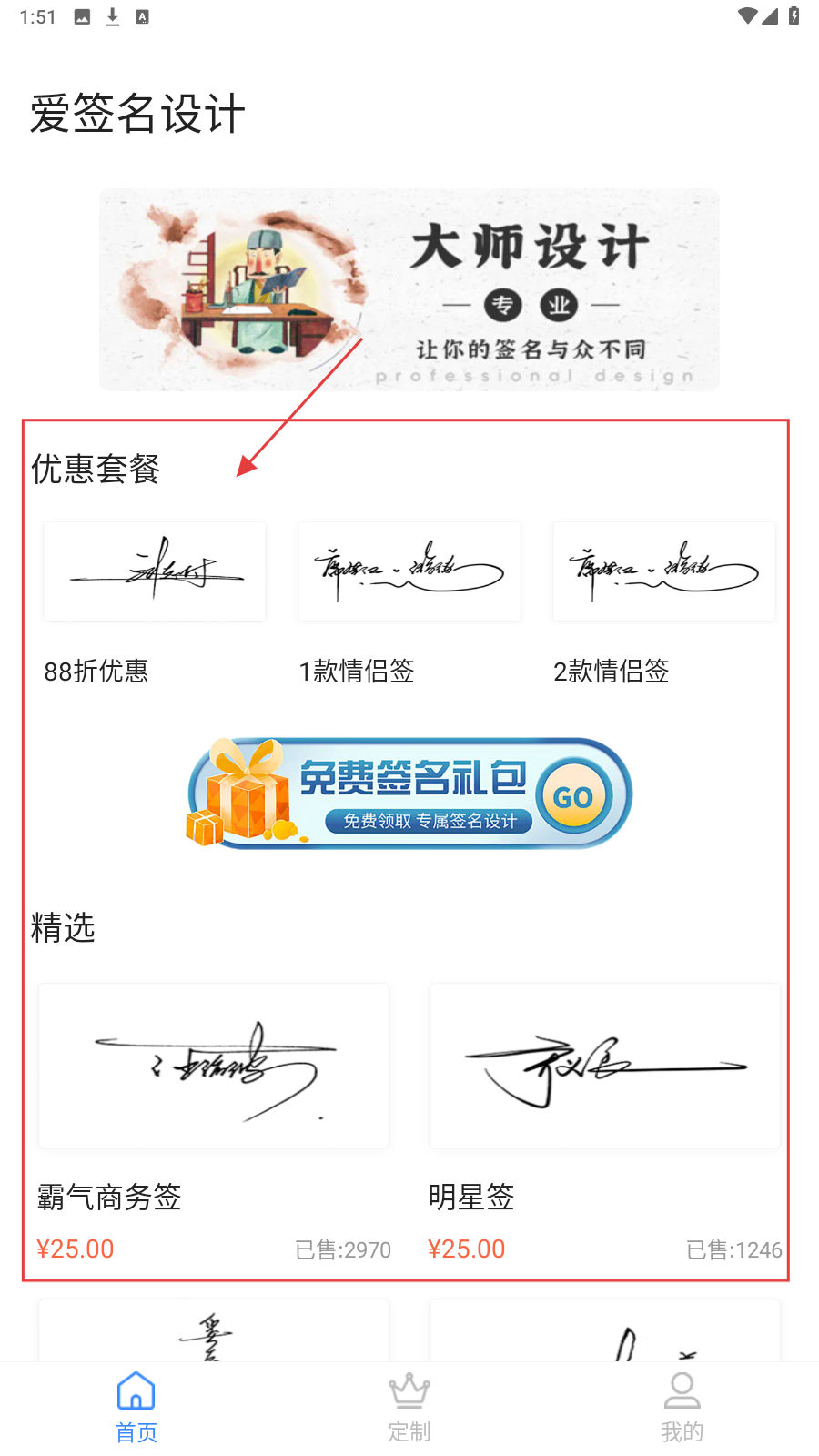 1、进入应用首页,按需选优惠套餐或精选签名样式,了解详情。