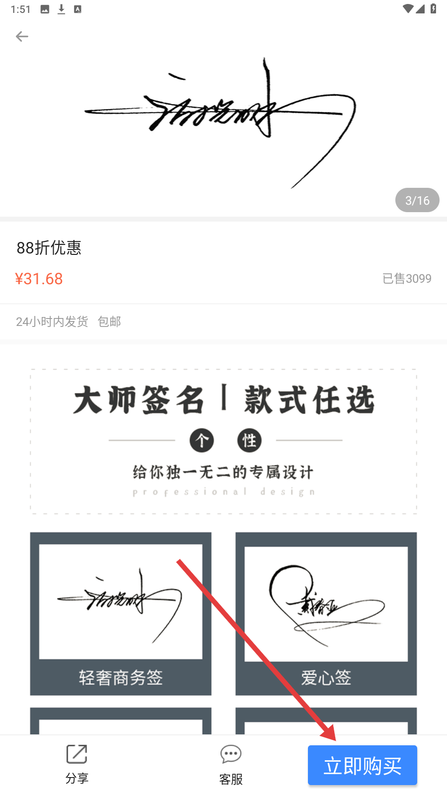2、若心仪某签名,进入详情页后点击【立即购买】,完成下单流程。