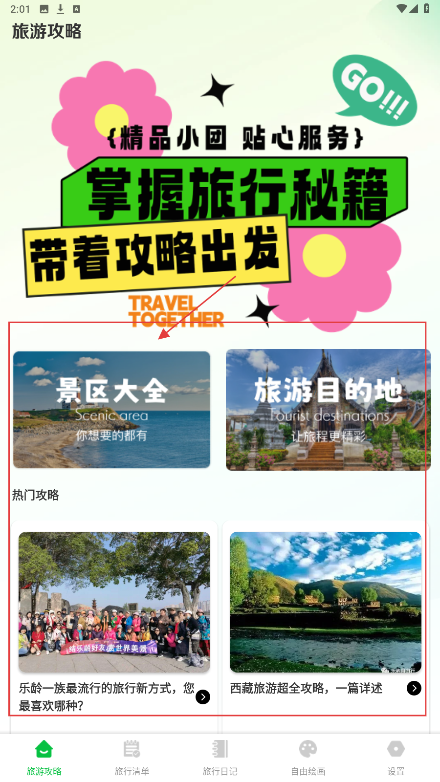 1、进入旅游攻略页,先点【景区大全】,了解各类景点信息,规划行程更高效。