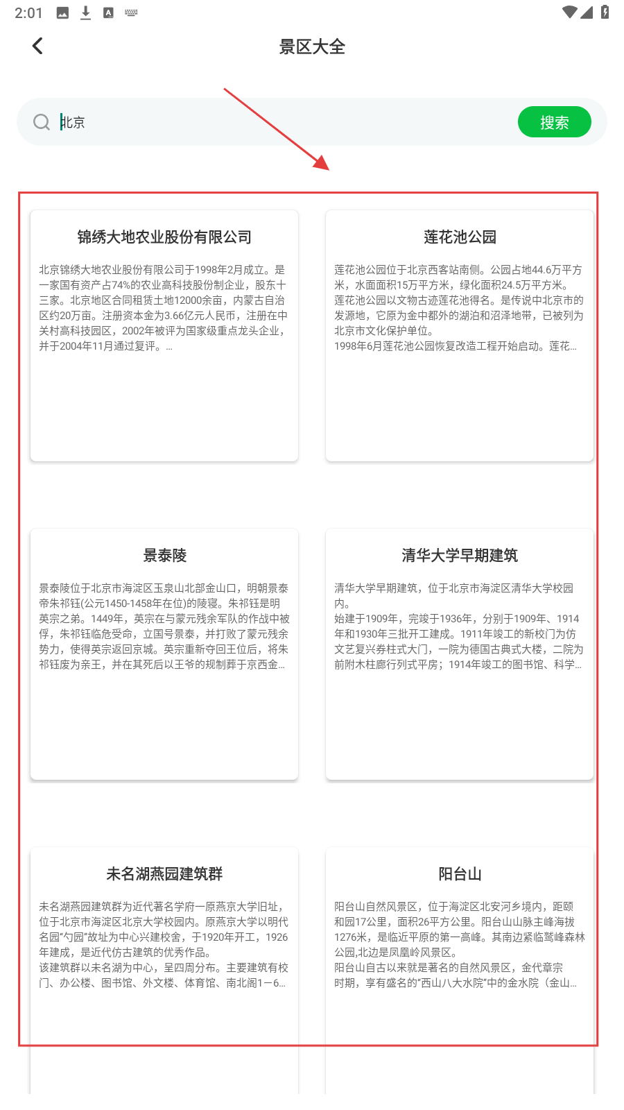 3、搜索城市后,浏览景区列表,如【莲花池公园】等,查看简介选感兴趣的深入了解。