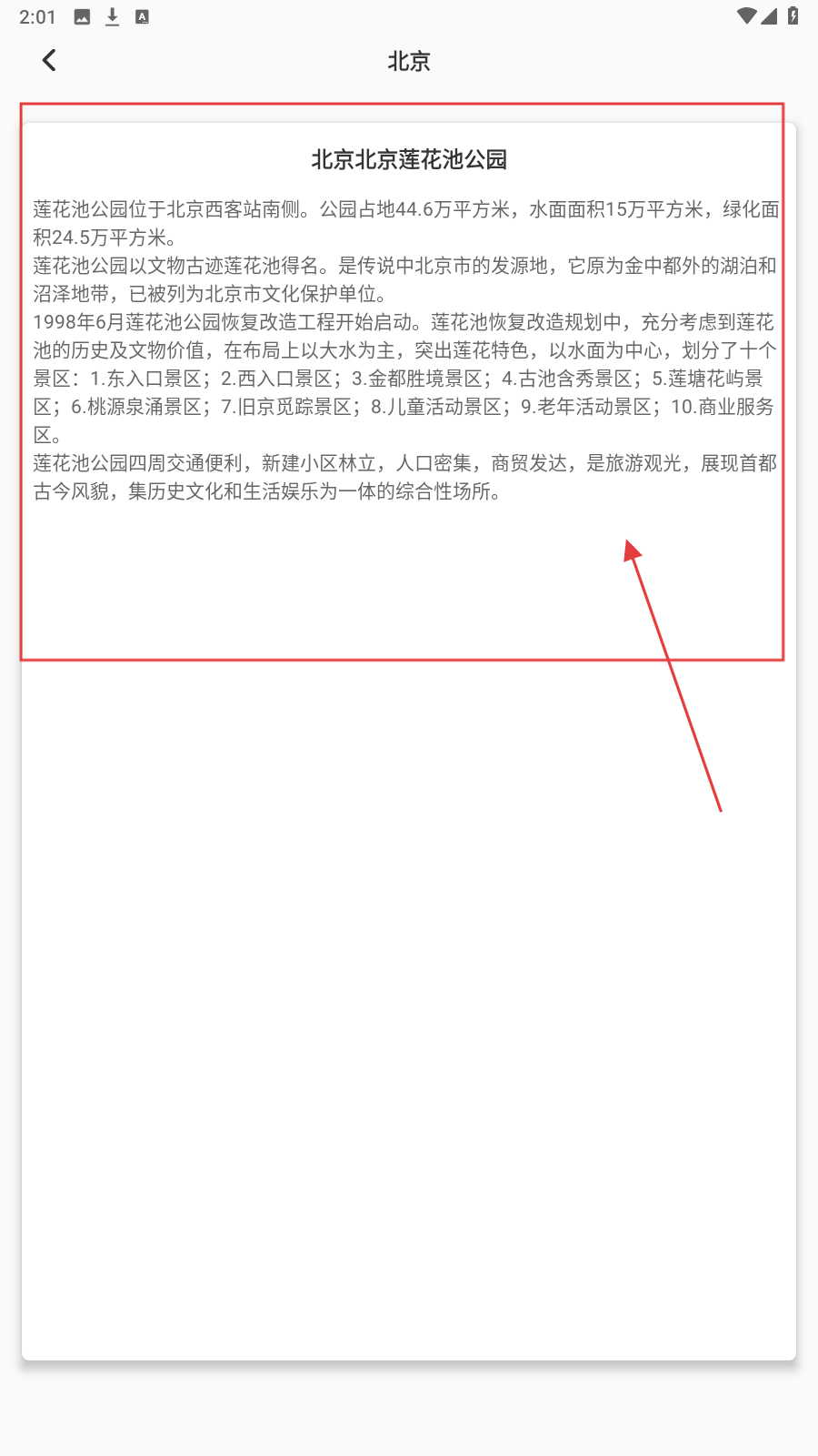 4、点进具体景区,像【北京莲花池公园】,研读详细介绍,掌握地址、特色等信息,助力旅行。