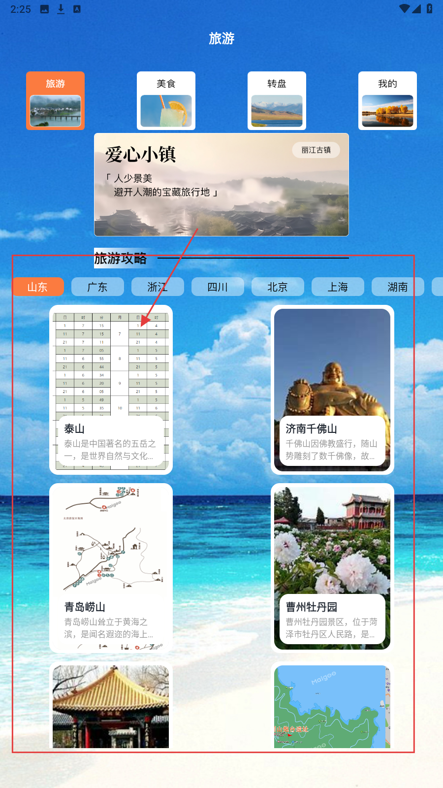 1、进入旅游页,选目标地区如【山东】,点泰山等景点卡片,查看详情规划行程。
