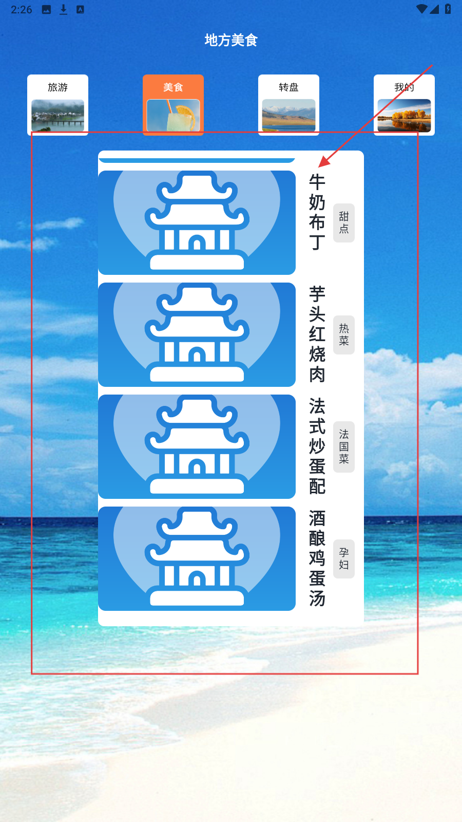 3、切换美食页,按需选【牛奶布丁】等分类,查看地方特色美味,安排美食体验。