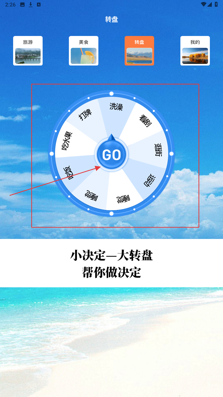 4、遇小抉择,用转盘功能,点【GO】转动,按结果选洗澡、逛街等活动做决定。