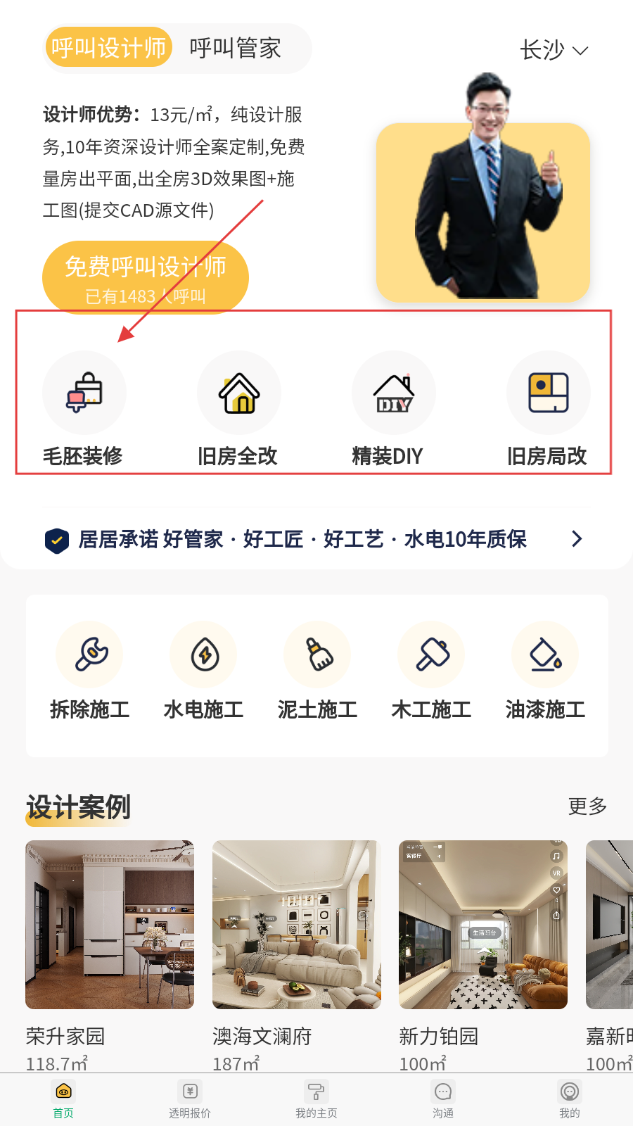 1、进入首页,按需选【毛胚装修】等服务类型,开启装修服务匹配。