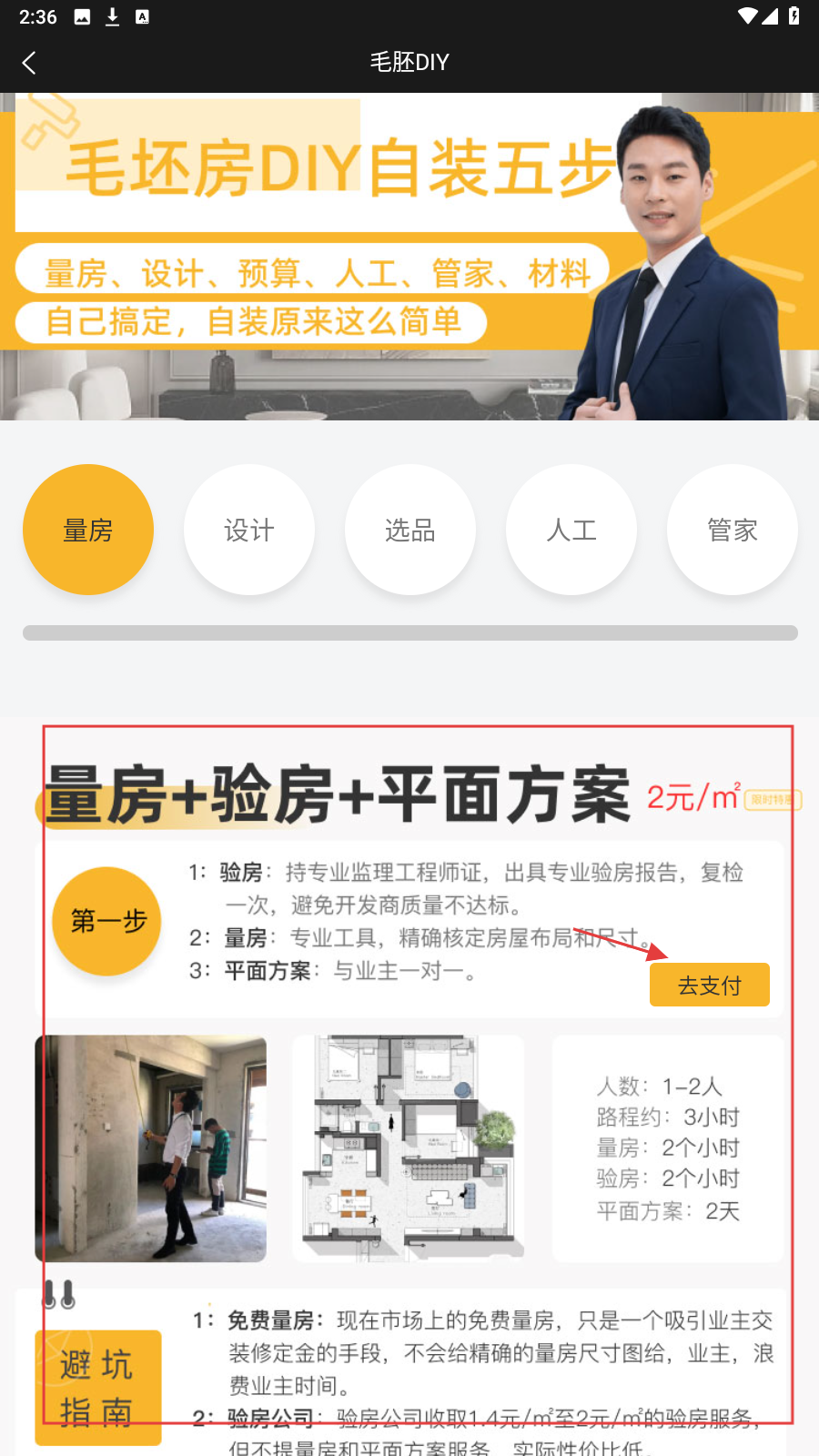 2、点【毛胚装修】,进入毛坯DIY页,选量房等步骤,按需购2元/㎡服务。