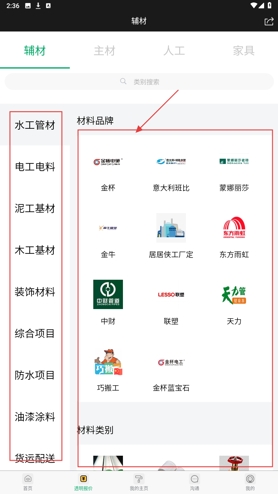 4、切换【透明报价】,选辅材等分类,按需选金杯等品牌材料,备齐装修物资。