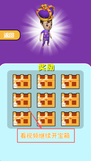4、完成关卡后,点击“看视频继续开宝箱”按钮,获取奖励。
