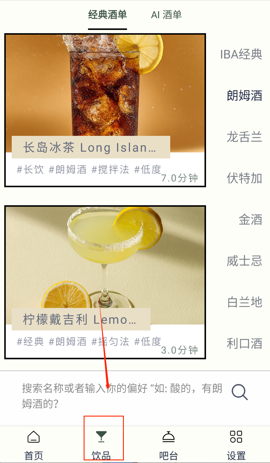3、在配方浏览页面可以通过筛选功能按酒精度、口味风格或制作难度查找饮品,每种配方都配有图文步骤和专家讲解视频,学习更直观。