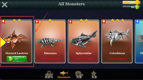 2、在“All Monsters”列表中点击20级“Horned Lantern”,将其加入孵化队列。