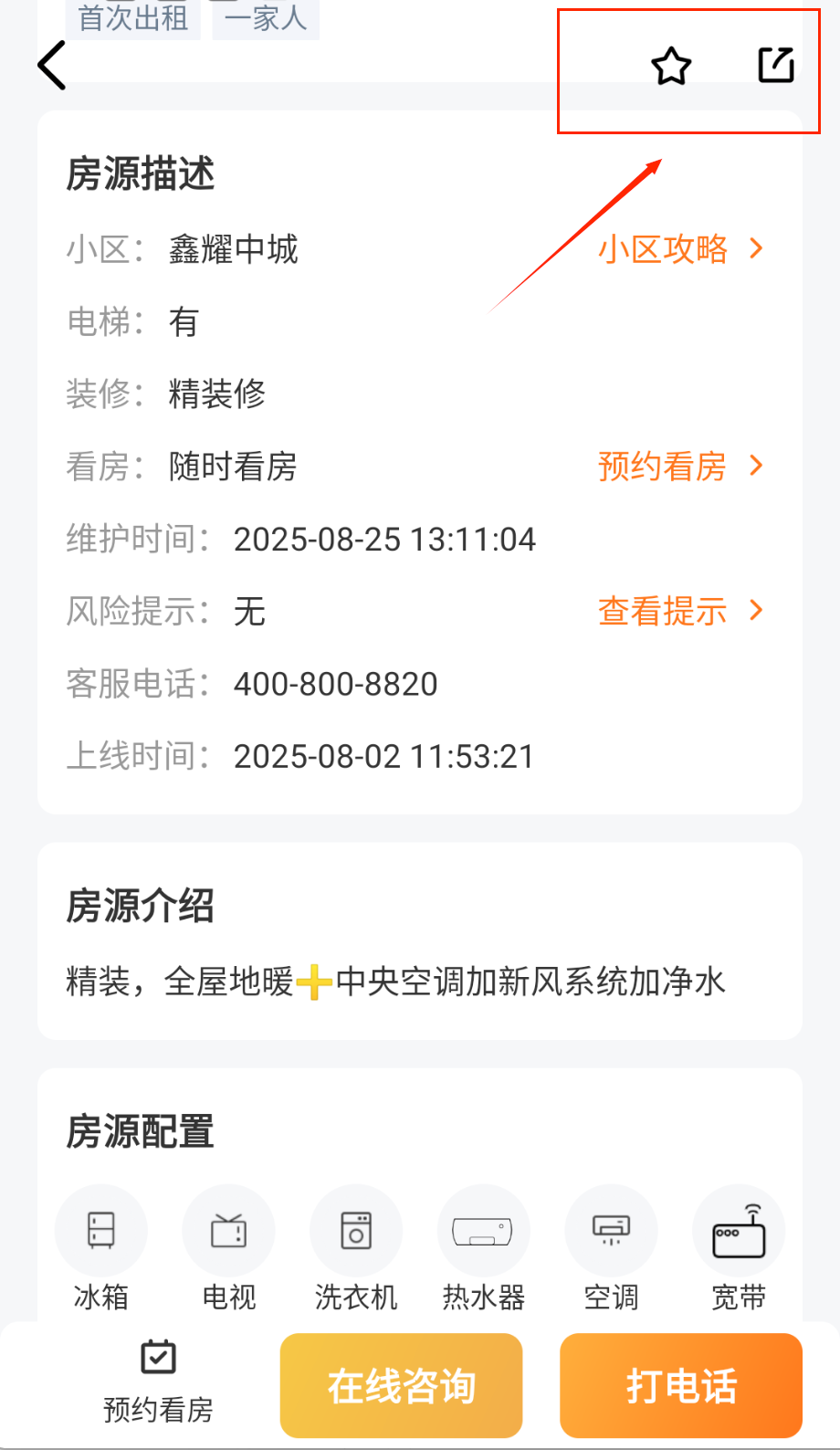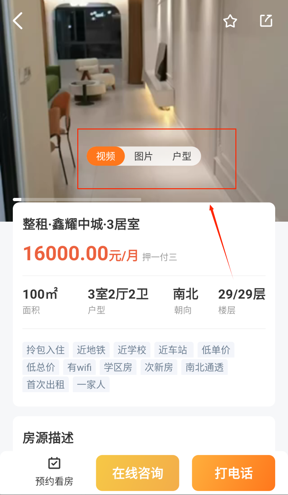 3、查看房源详情页的实景照片和视频,了解房屋具体情况,通过内置聊天功能与房东沟通看房时间。